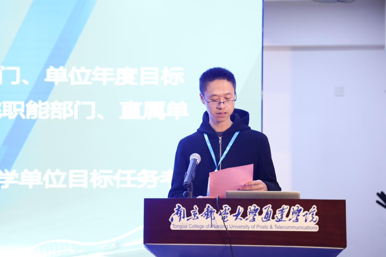 会上,党办、院办主任张荣、人事处处长王志锋、教务处处长李兵分别就《南京邮电大学通达学院各部门、单位年度目标任务考核办法》《南京邮电大学通达学院职能部门、直属单位目标任务考核实施细则》《南京邮电大学通达学院教学单位目标任务考核实施细则》《南京邮电大学通达学院教职工分类考核实施办法》等四个文件草案向大会代表进行了详细解读。